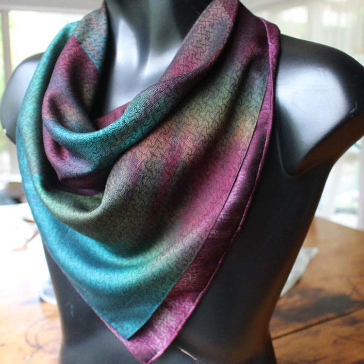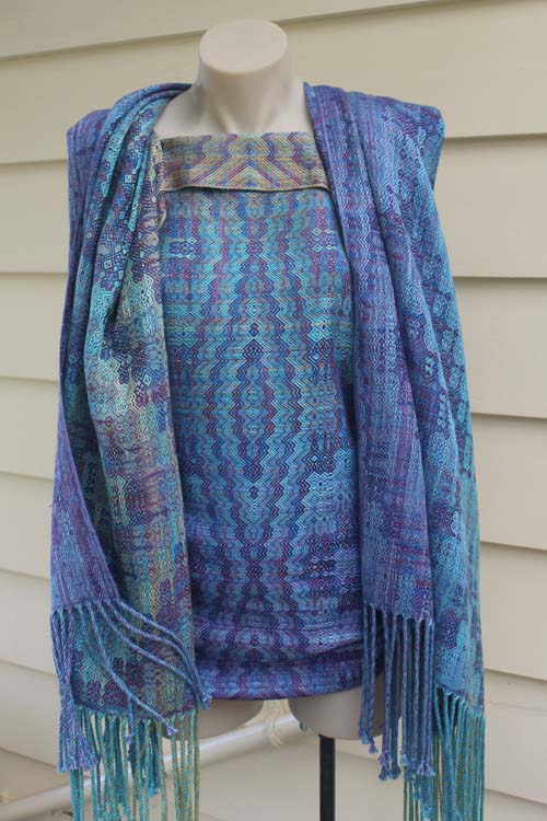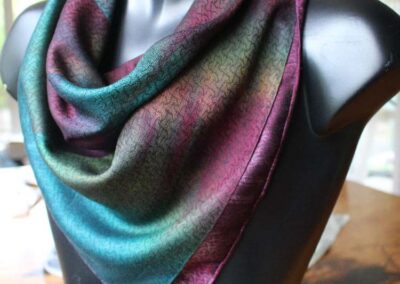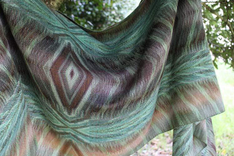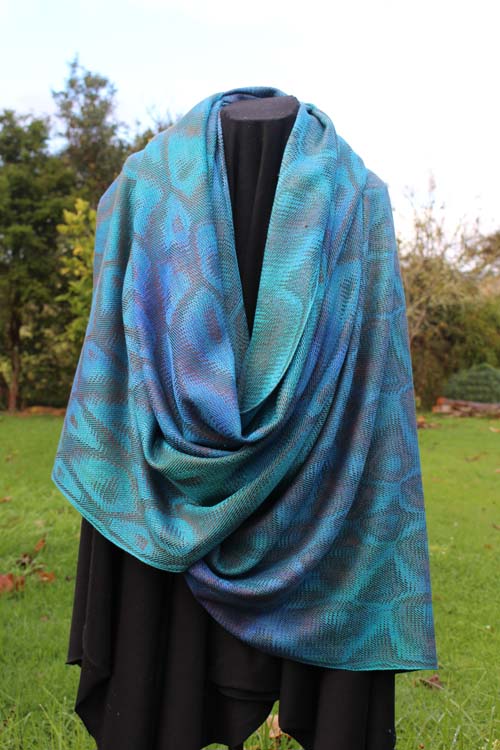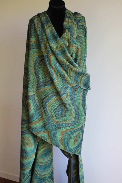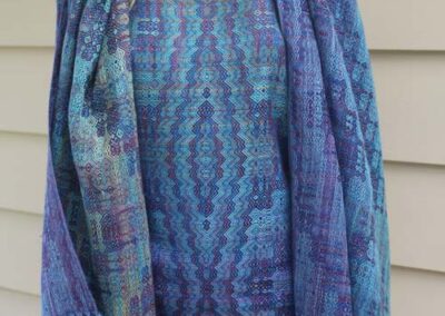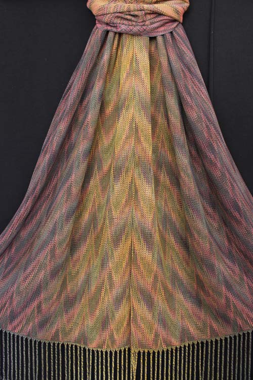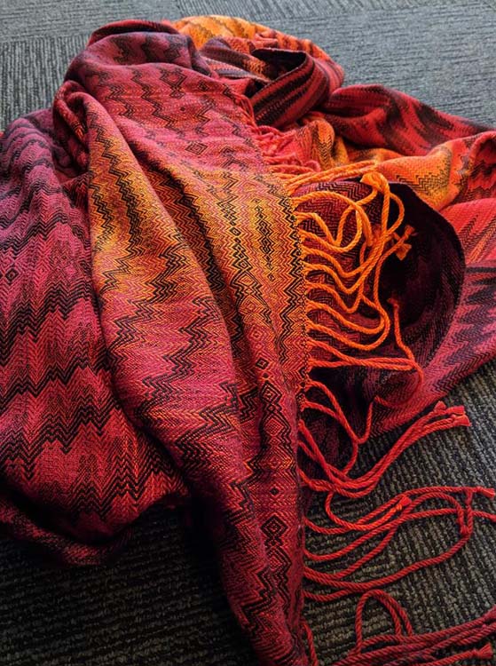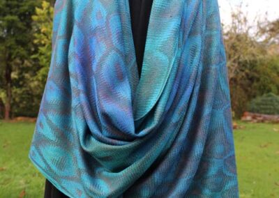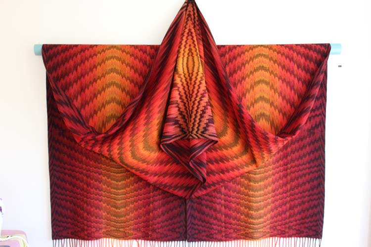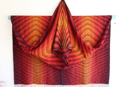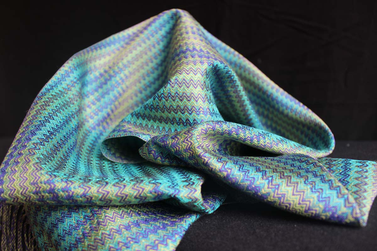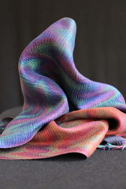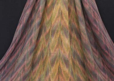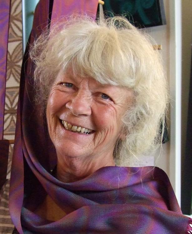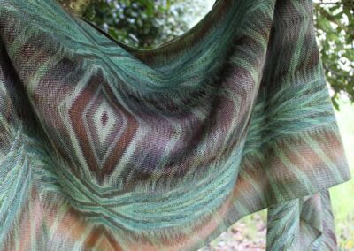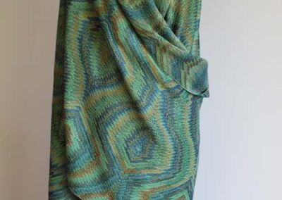 Today, Agnes is working and teaching from the purpose built workshop on a wonderful property in the Far North of New Zealand and weave mostly scarves, shawls, household items, baby blankets and baby wraps as well as exhibition and experimental pieces on several different looms. She loves to work with very fine silk threads and like to create pieces that show complex patterns and beautiful iridescence.