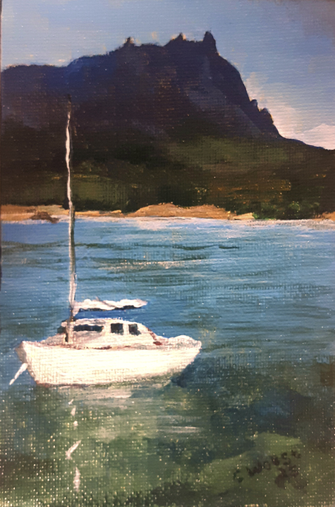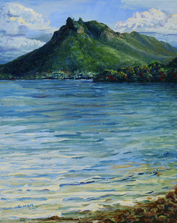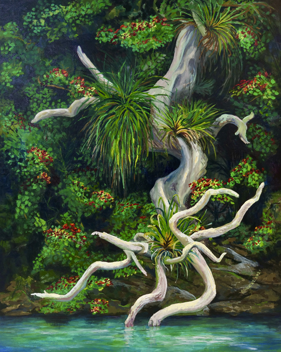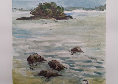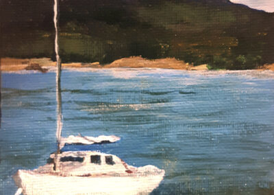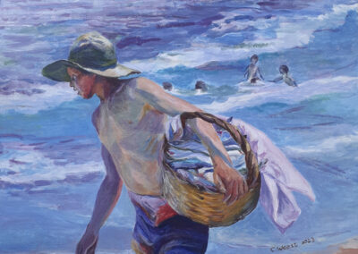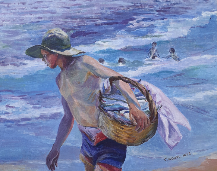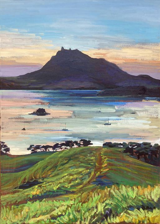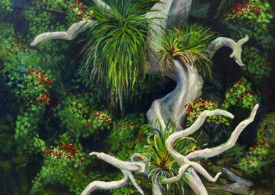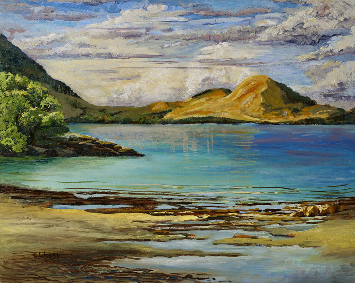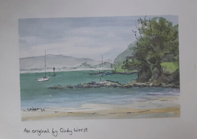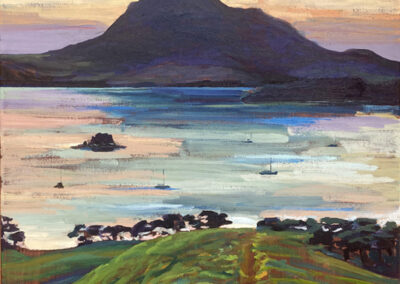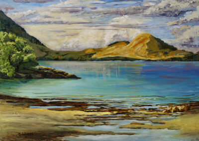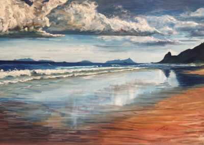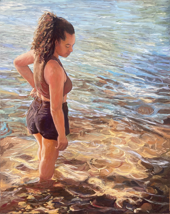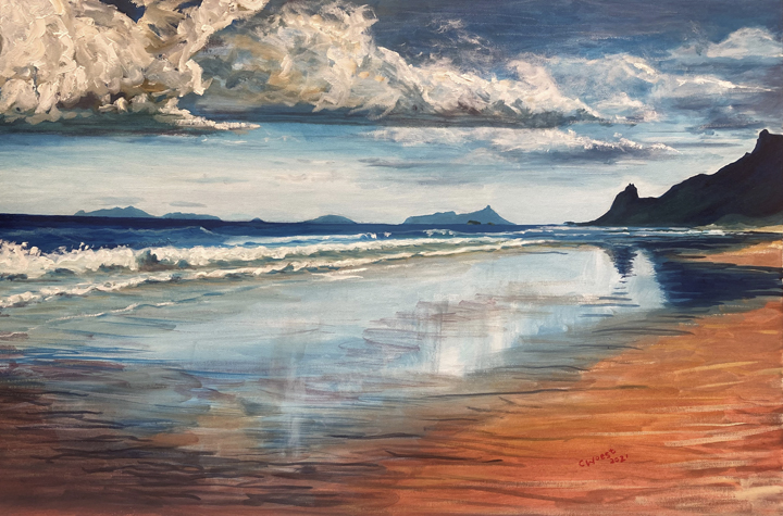 For Cindy, the most fulfilling aspect of her work is creating commissioned pieces that resonate deeply with her clients, bringing joy, cherished memories and beauty to their everyday lives. Living amidst the breathtaking scenery of Whangarei Heads, Cindy immerses herself in its landscapes, capturing the essence of this place in many of her paintings. Her art is driven by the interplay of colour and light, captured through painterly realism. One of Cindy’s most famous paintings is Jess in the tide – a large 102 x 77 cm oil on board painting of Jess standing in the incoming tide of the Taiharuru inlet, near Pataua South. “It was a beautiful day, and the sun was glistening off the incoming tide and illuminating Jess’s back. I just had to capture the memory” Cindy explains, “The painting is a symbol of a special family day spent exploring the Northland coast. I’ll treasure it forever.”
